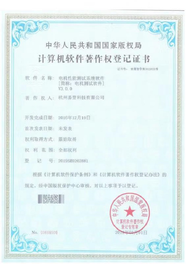 電機(jī)性能測(cè)試系統(tǒng)軟件證書(shū)