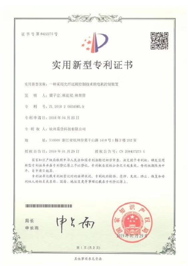 電機(jī)電控裝置專(zhuān)利證書(shū)