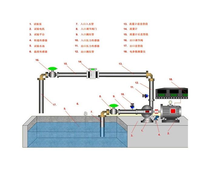 2、水泵測試系統(tǒng)采用開式結(jié)構(gòu)的標準試驗裝置,試驗回路保證通過測量截面的液流具有軸對稱的速度分布,等靜壓分布和無裝置引起的旋渦。